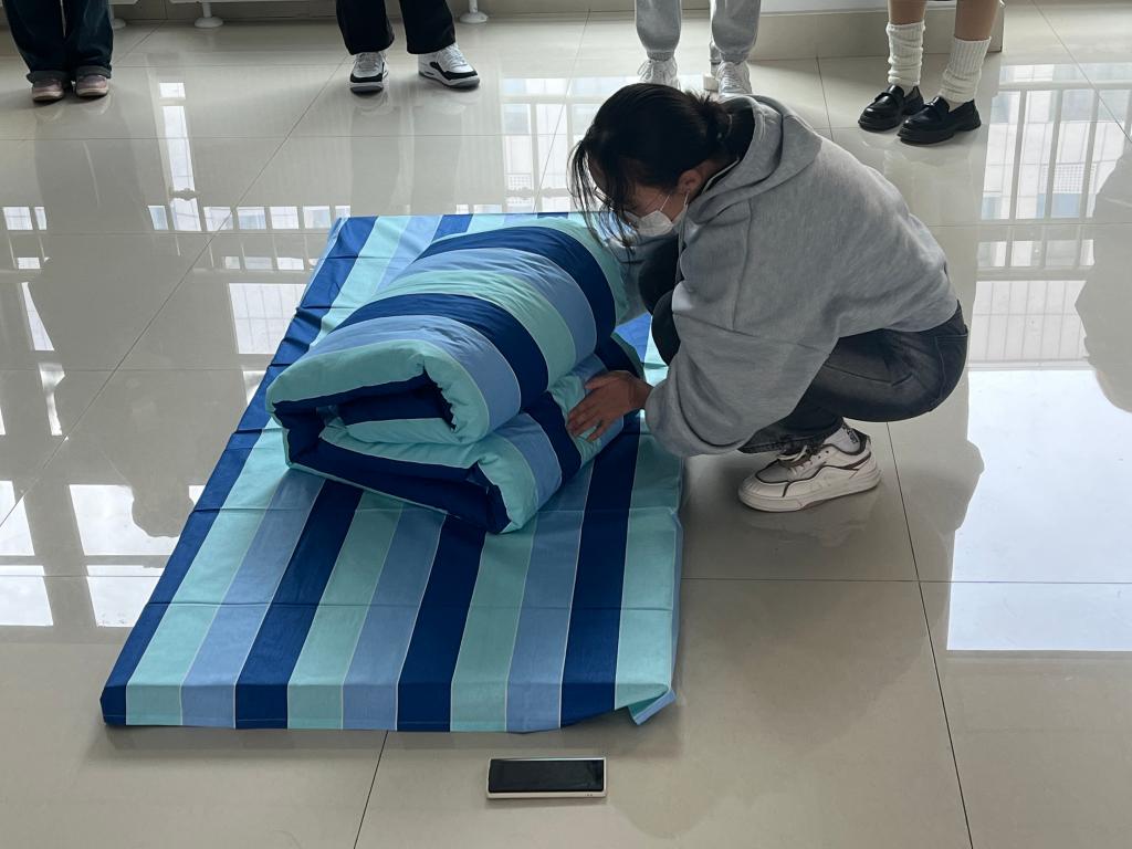 比赛过程中同学们个个全力以赴,认真对待。整齐划一的动作、娴熟的技巧都展现在评委们面前。大家将平铺的被子折叠、压实,用两手辗出棱角,通过抖整被、孴方块、压幅条、提棱角等方式将被子叠的整整齐齐,棱角分明。经过激烈的角逐最终评出一等奖五名,二等奖十名,三等奖十五名。
