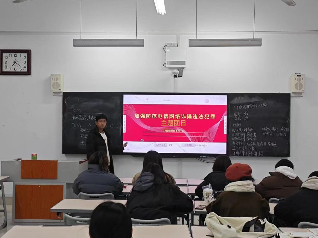 活动过程中,各班团支书首先给同学们介绍了何为诈骗,诈骗的基本含义,诈骗的类型有哪些,并给同学们播放了关于反诈的视频以及如何预防诈骗的视频,让大家进一步深入了解到了诈骗的危害性,随后以PPT的形式向同学们分析了各种电信诈骗手段,结合典型案例重点讲解了常见的校园诈骗,特别是针对老员工的诈骗,提出了相应的防诈骗策略,呼吁大家认真学习防诈知识,增强防范意识,提高防诈能力。