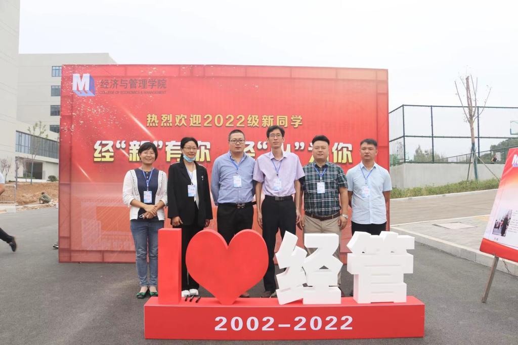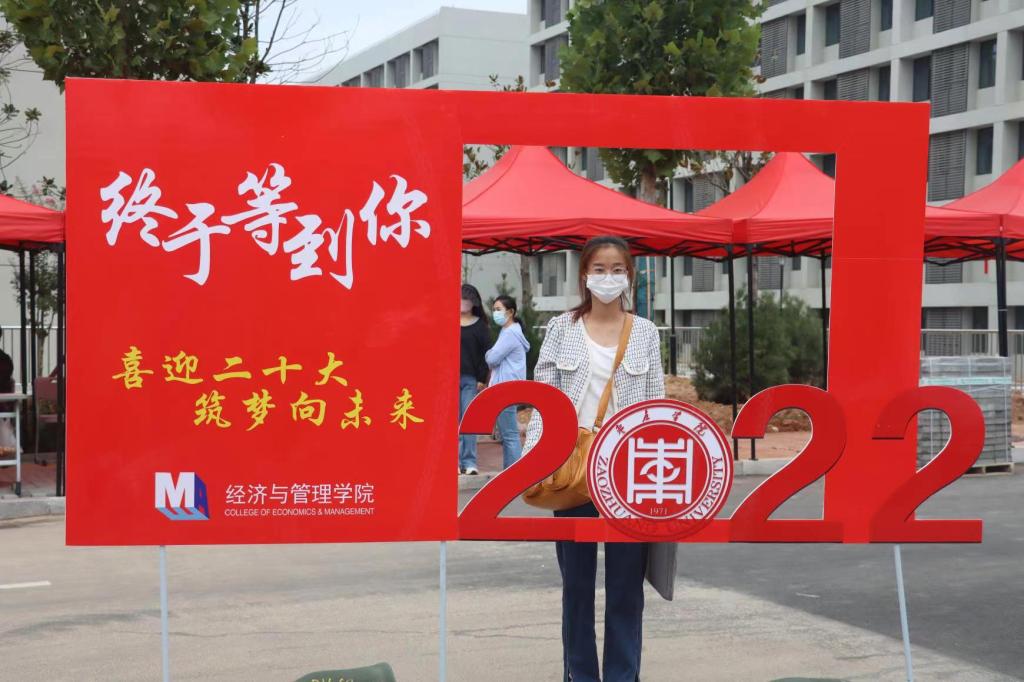报到完成后,新生们纷纷去往带有经“新”有你,经“心”为你字样的背景板签名拍照,与两位志愿者装扮的迎新财神合影,留下开学第一天的珍贵记忆。