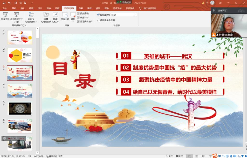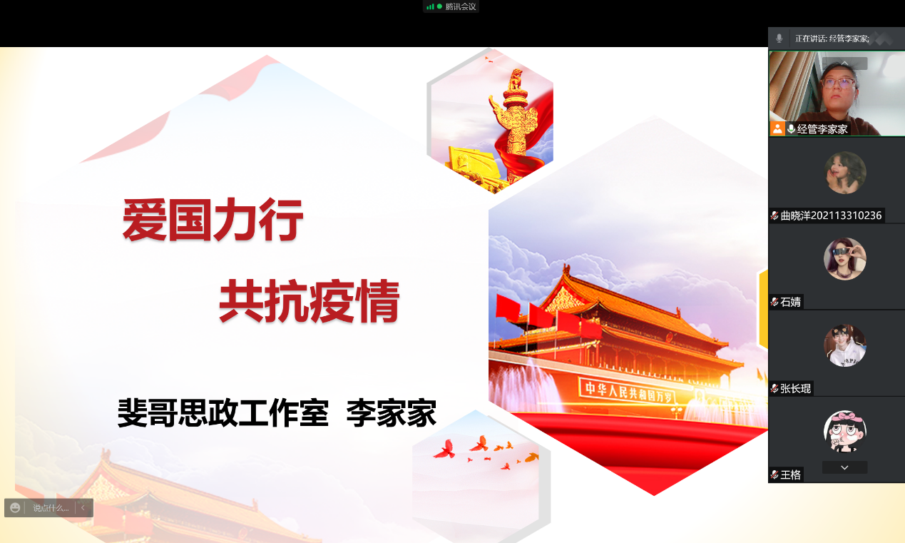 为弘扬抗疫精神,凝聚奋进力量,10月22日,bw必威西汉姆联官方网站以腾讯会议直播的形式召开“爱国力行,共抗疫情”主题教育讲座,讲座由公司辅导员、斐哥思政工作室成员李家家主持,部分毕业生参加。