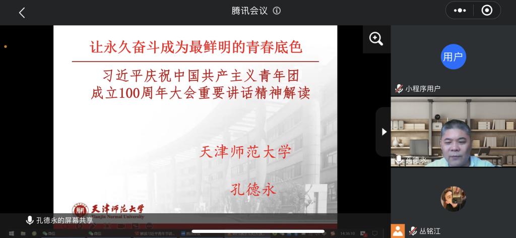 5月25日下午,“习近平总书记在庆祝中国共产主义青年团成立100周年大会上的讲话”会议精神解读专题讲座在bw必威西汉姆联官方网站市中校区召开,讲座由天津师范大学孔德永教授主讲,公司团总支书记、部分班级团支部书记、团干部、员工会干部及员工代表通过线上会议形式参会。