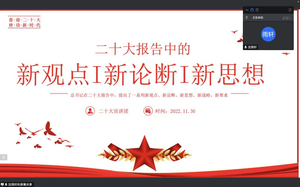 11月30日,由员工会部长组成的宣讲团采用线上线下相结合的方式,以“理论阐释+形势政策教育+故事分享”的方式走进课堂,向2022级班级宣讲了二十大精神。