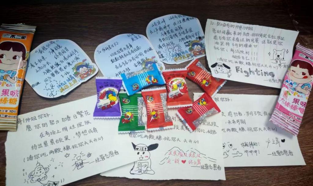 活动当天,志愿者们提前整理物资、布置场地,以自习室、图书馆、走廊等学习区域为“暖心驿站”,有序开展服务。在严格遵守自习秩序的前提下,志愿者们为备考学子送上了精心准备的应季水果、保暖围巾、暖宝宝等实用物资。此外,志愿者们还亲手书写了励志加油纸条,围绕“坚定信念、劳逸结合、终获佳绩”等主题,以真挚恳切的话语为学子们注入精神动力,帮助其缓解备考压力。