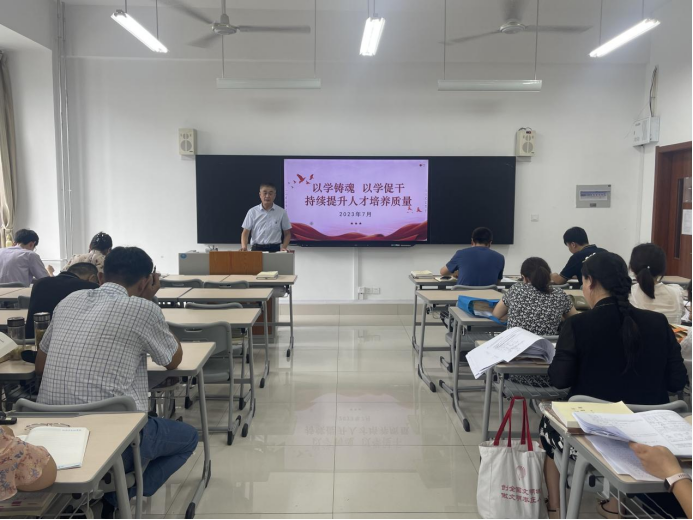 为深入开展学习贯彻习近平新时代中国特色社会主义思想主题教育,坚定办好人民满意的高等教育,7月13日,经济与管理公司党总支副书记、经理刘振宇以《以学铸魂以学促干持续提升人才培养质量》为题讲授主题教育专题党课,经管公司全体教职工参加。