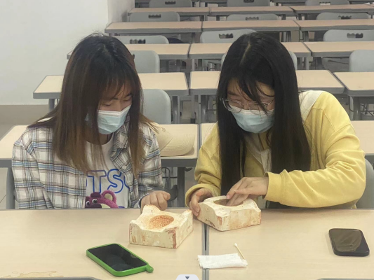 首先通过一个热身小游戏,使同学们彼此熟悉起来,心情慢慢放松。然后,张春侠介绍了伏里土陶悠久的发展历史以及土陶文化传承的现状。同学们认识到土陶文化的博大精深。最后,学习土陶的手工制作。两人一组,根据模具制作,每人负责一面。由于员工制作土陶经验不足,张春侠做了示范;从揉泥、压平、上模、合模、到25分钟出模、修模等环节,边讲解边示范。同学们很快上手,成功制作出古雅神秘的土陶。